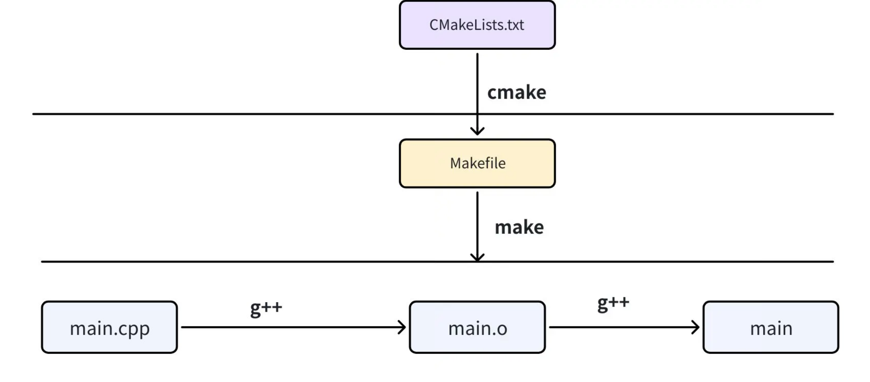 命令即可获得编译后的可执行程序,接下来运行可执行程序即可看到执行结果。可以得出CMake从构建到获得执行程序的整个流程如下: