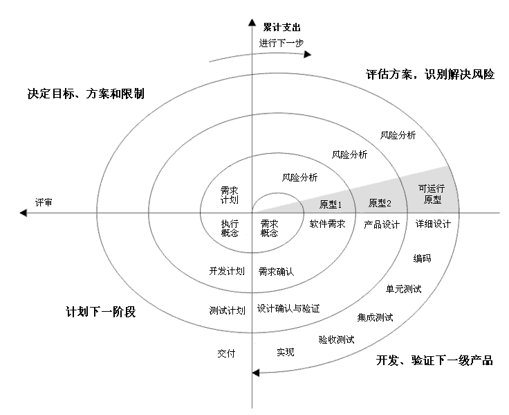 一般在软件开发初期阶段需求不是很明确时,采用渐进式的开发模式。螺旋模型是渐进式开发模型的代表之一