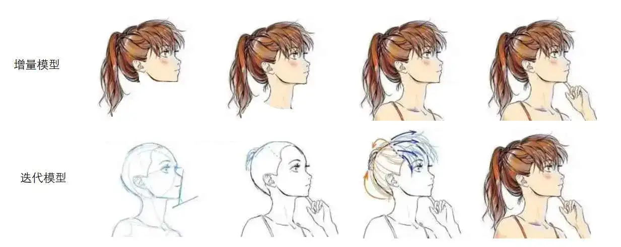 与此类似的有一个迭代开发,增量开发和迭代开发往往容易混淆,但是其实两者是有区别的。增量是逐块建造的概念,迭代是反复求精的概念。以一副人物画像为例: