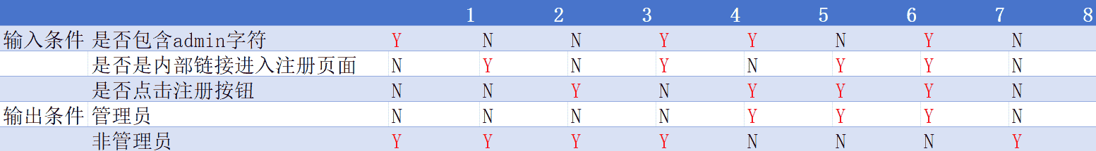 字符、内部连接进入注册页面、点击注册按钮。输出条件:管理员和非管理员 - 输入条件和输出条件的关系:账号包含
